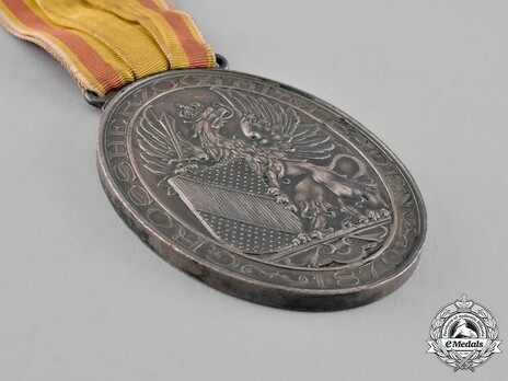 An ovular medal constructed of silver plated bronze. The obverse bears the image of a crowned griffin with the coat of arms of Baden, encompassed by a border with the inscription "GROSSHERZOGTHUM BADEN 1870". The reverse bears the image of a crowned griffin with outspread wings, with a border with the inscription "DEUTSCHES KAISERREICH 1871". With a horizontally elongated suspension, on a red ribbon with a yellow stripe.