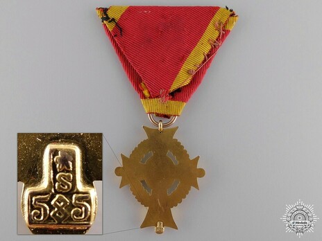 A Latin cross with concaved arms constructed of gold or silver gilt and enamels. The quadrants between the arms bear a green enameled oak wreath with small red berries. The obverse bears an ovular medallion with the crowned cipher "W" encompassed by a twisted border. The arms of the cross bear the inscription "IMMOTA FIDES". The reverse is plain. On a loop for suspension on a red ribbon with yellow stripes.