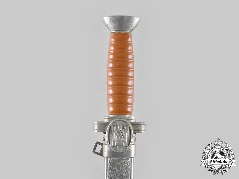 The handle of the dagger is made up of the pommel, the grip, and the crossguard. The metal fitting are generally composed of pot metal with a dull nickel plating. The pommel has a plain, oblong shape and a multi-slotted screw cap, flush with the flat top of the pommel. The grip is grooved, with 9 wide and 10 narrow alternating horizontal bands. The grip was originally produced of light yellow celluloid, but as a result of aging, the grip generally appears dark yellow or orange. The crossguard arms are rectangular-shaped with rounded ends, and the obverse and reverse crossguard have an oval plate. The obverse plate features the 1938 2nd pattern DRK eagle, while the reverse tends to be blank, but in rare instances may be stamped with the wearer’s unit number or even the unit control number.