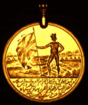 The obverse features a Farsi inscription that translates to “This Medal has been Presented in Commemoration of the Defeat of the French Army in the Kingdom of Egypt by the Great Bravery of the Victorious Army of England.” The medal was issued unnamed, and it was typically worn on a yellow cord.