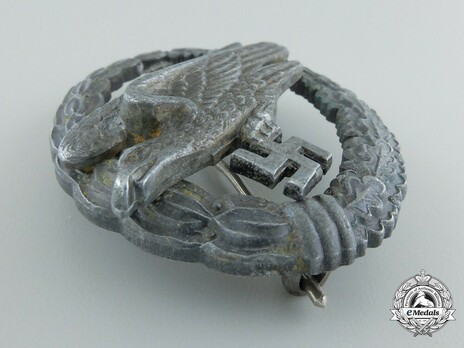 The initial regulations stated that the wreath of the badge was to be made of oxidized Neusilber. Neusilber, also known as nickel silver, is an alloy of brass and nickel, and does not in fact contain actual silver. Oxidizing nickel silver darkens it and gives it an antique look. The eagle was to be made of gilded brass.