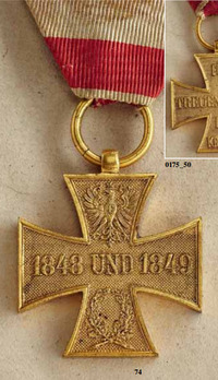 A cross pattée constructed of bronze or bronze gilt. The obverse bears the inscription "1848 UND 1849" across the 9 and 3 o'clock arms, with a crowned eagle with outstretched wings on the 12 o'clock arm and a wreath on the 6 o'clock arm. The reverse bears the inscription "FÜR TREUE DIENST IM KRIEGE" (for loyal services in war). On a loop for suspension, on a white ribbon with red stripes.